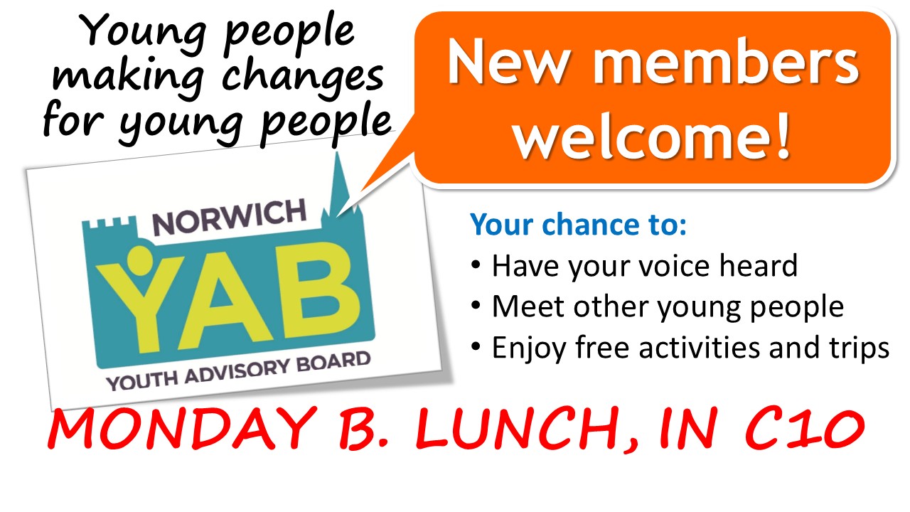 You can also get involved in Norwich Youth Advisory Board which gives young people a voice on local services and issues that concern them. For more info, see the drop down menu below.
