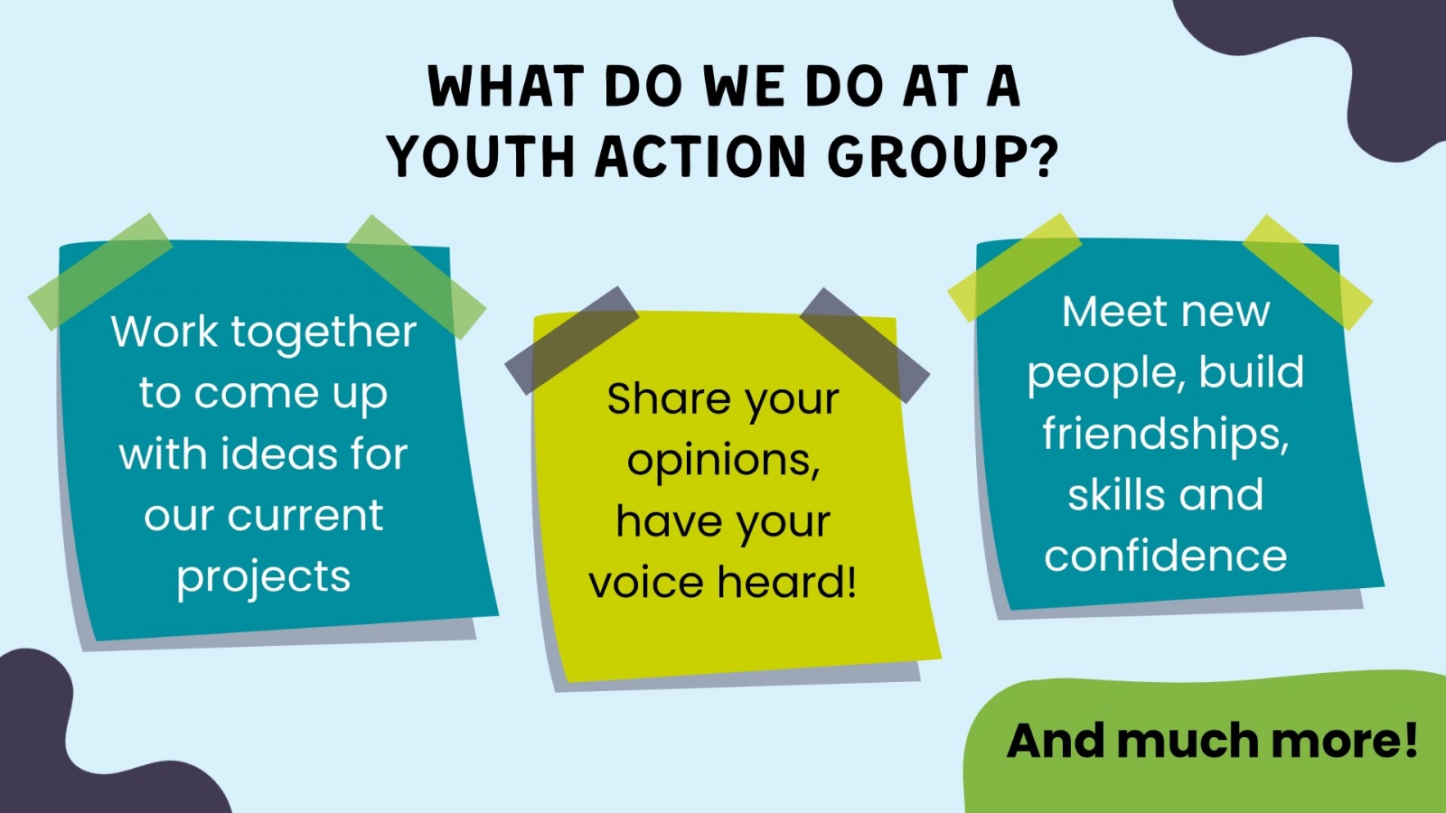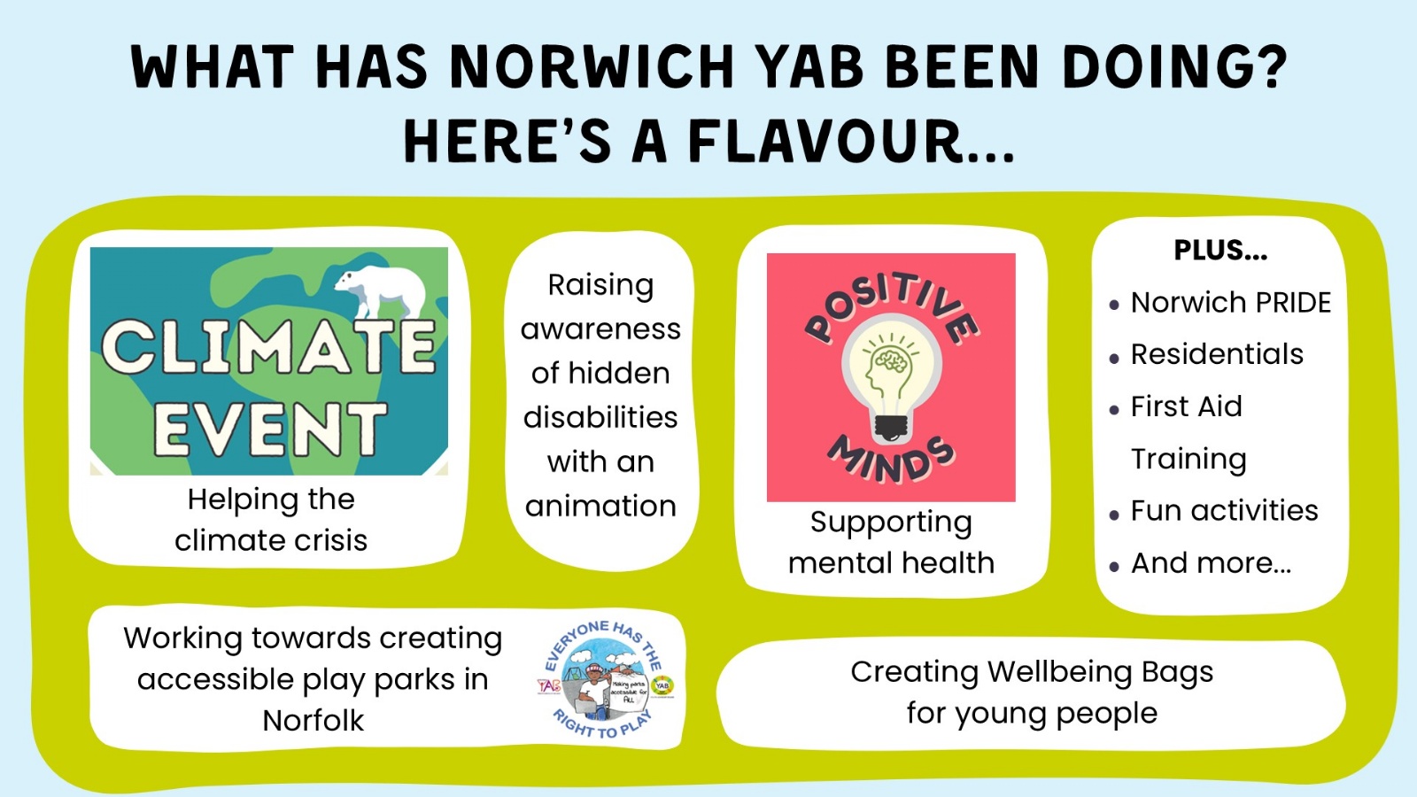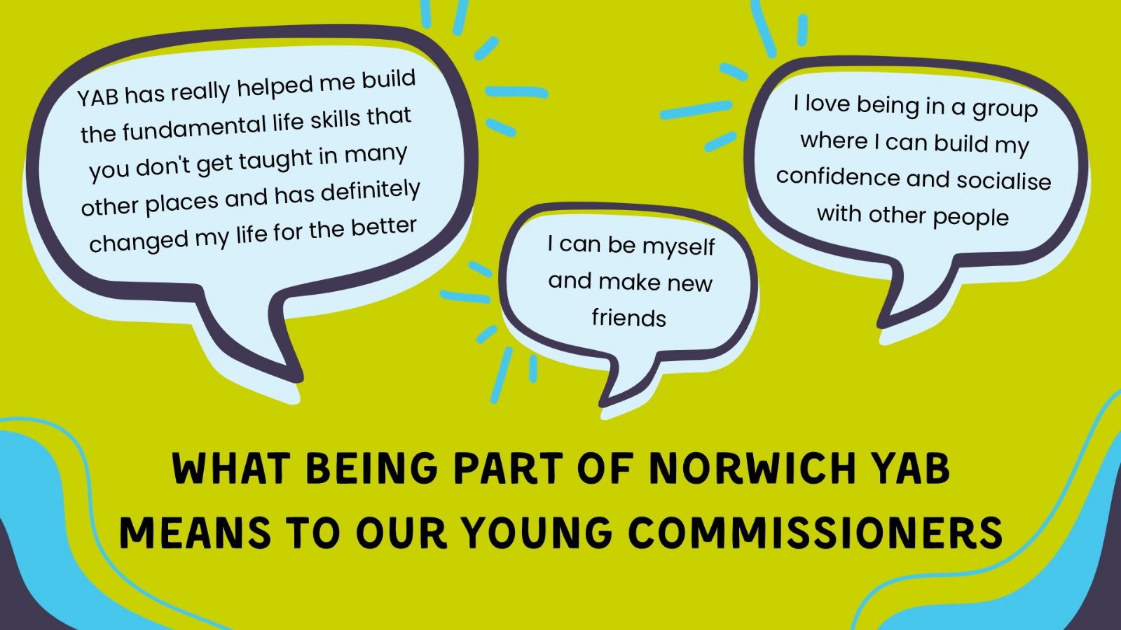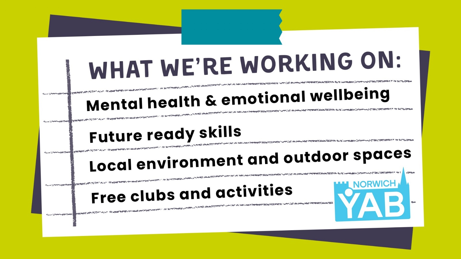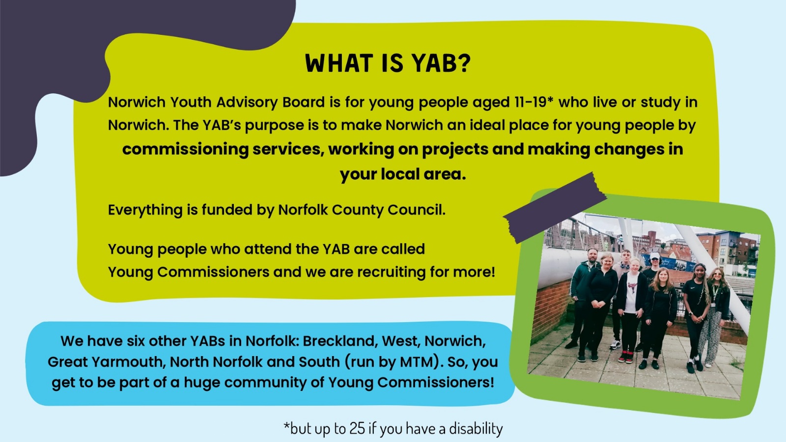 Youth Advisory Boards (YAB) are a group of young people working with professionals to improve their area. YABs help choose what projects get funded and design new services.