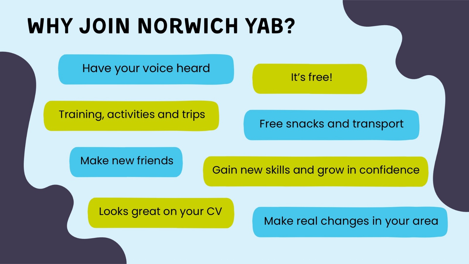 You can also get involved in Norwich Youth Advisory Board which gives young people a voice on local services and issues that concern them. For more info, see the drop down menu below.